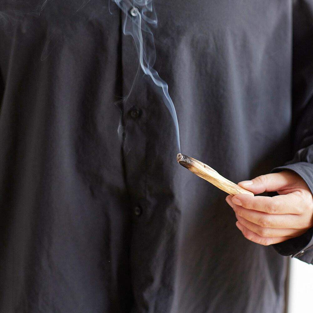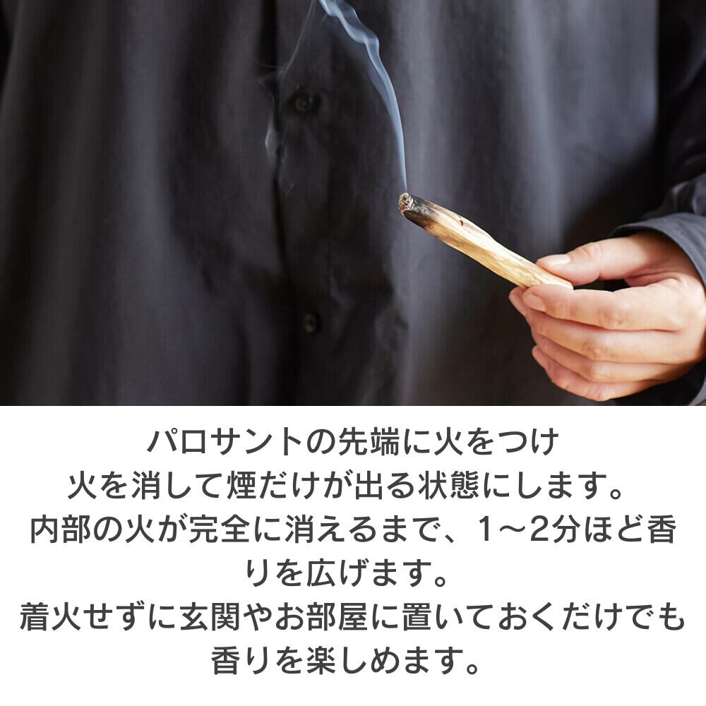 パロサントの先端に火をつけ、火を消して煙だけが出る状態にしてお使いください。内部の火が完全に消えるまで、2〜3分ほど香りを広げます。