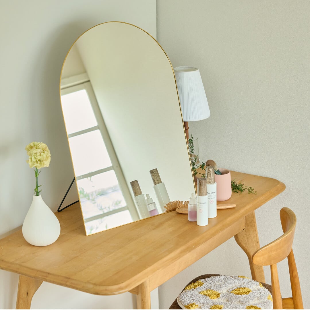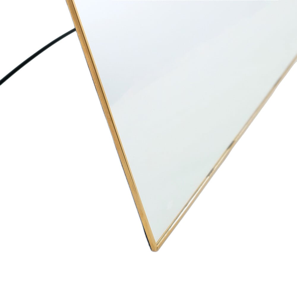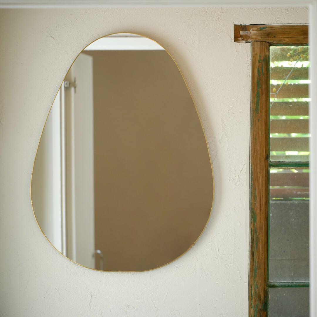 ブラスの枠にミラーをはめ込んだ壁掛け・スタンドのどちらでも使えるミラー。